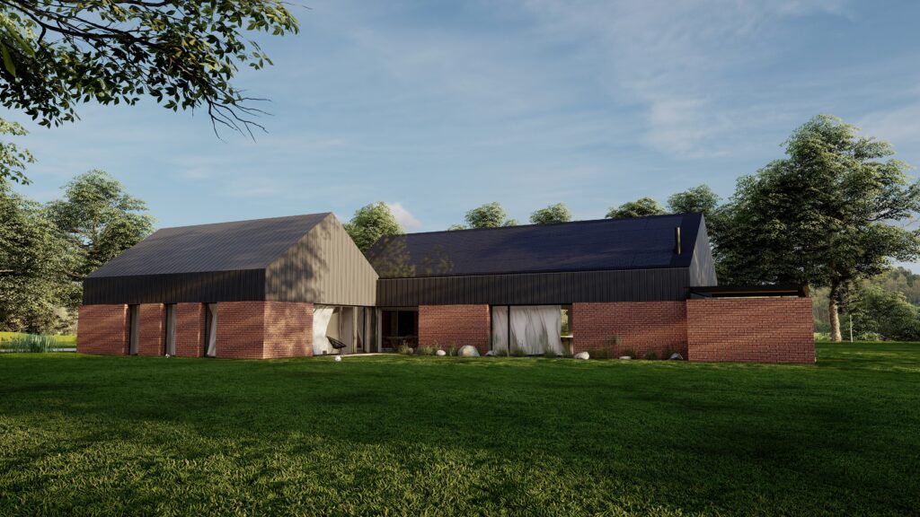 Inwestycja położona jest pod Wrocłąwiem, duża działka będąca zakresem opracowania jest otoczona praktycznie z każdej strony lasem. Usytuowanie budynków na działce wynikało z analizy otoczenia. Założeniami było otwarcie pomieszczeń na otaczającą przyrodę, ukształtowanie reprezentacyjnej strefy wejściowej, znalezienie optymalnego nasłonecznienia zarówno dla oświetlenia wnętrz jak i fotowoltaiki.