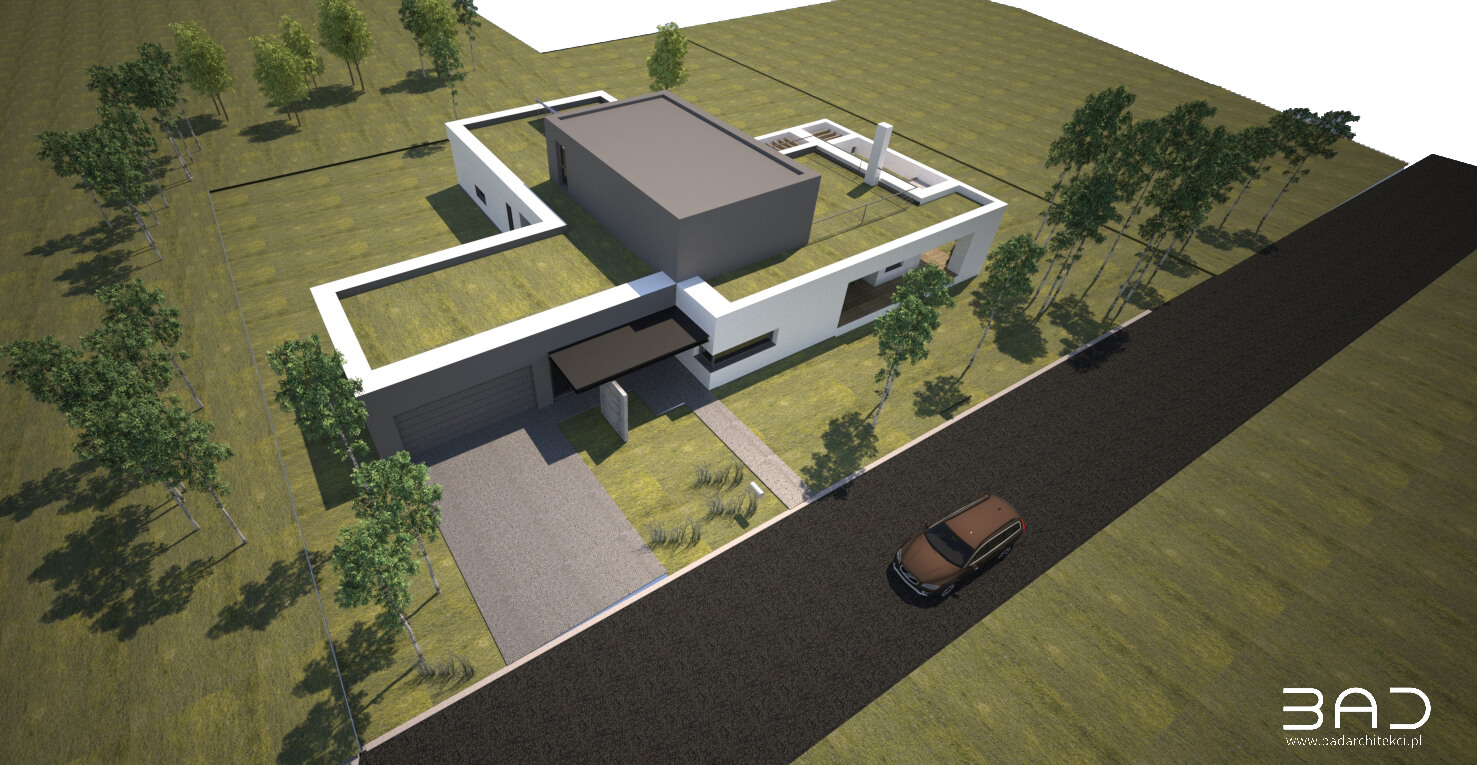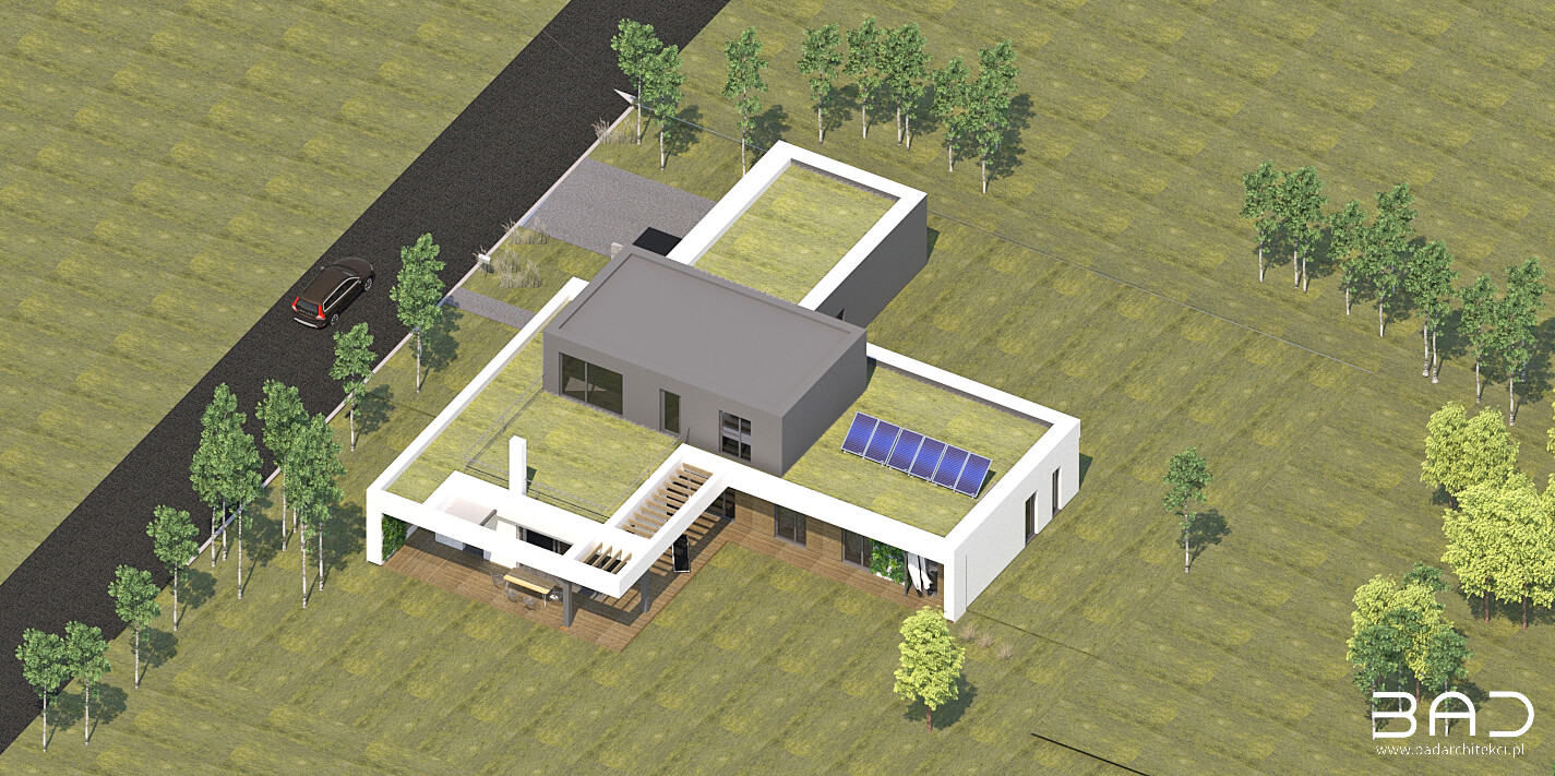 Dom “+” niedaleko Konina. Jest to duży, budynek parterowy z antresolą i płaskim zielonym dachem o powierzchni 291 m². Z uwagi na uwarunkowania lokalne- duża działka, południowy widok oraz wjazd od strony zachodniej; zdecydowano się zlokalizować bryłę budynku w północnej części działki. Lokalizacja ta daje możliwość korzystnej całorocznej ekspozycji słonecznej oraz „wyciągnięcia” części dziennej do centrum działki. Uzyskujemy w ten sposób pełną panoramę widokową i otwarcie na działkę. Odsunięcie to umożliwia wytworzenie głównego tarasu rekreacyjnego od południowo- wschodniej strony i uzupełniająco również od strony zachodniej. Kształt budynku „+” urbanistycznie umożliwia korzystne wydzielenie poszczególnych stref funkcjonalnych w budynku i ich powiązanie z działką